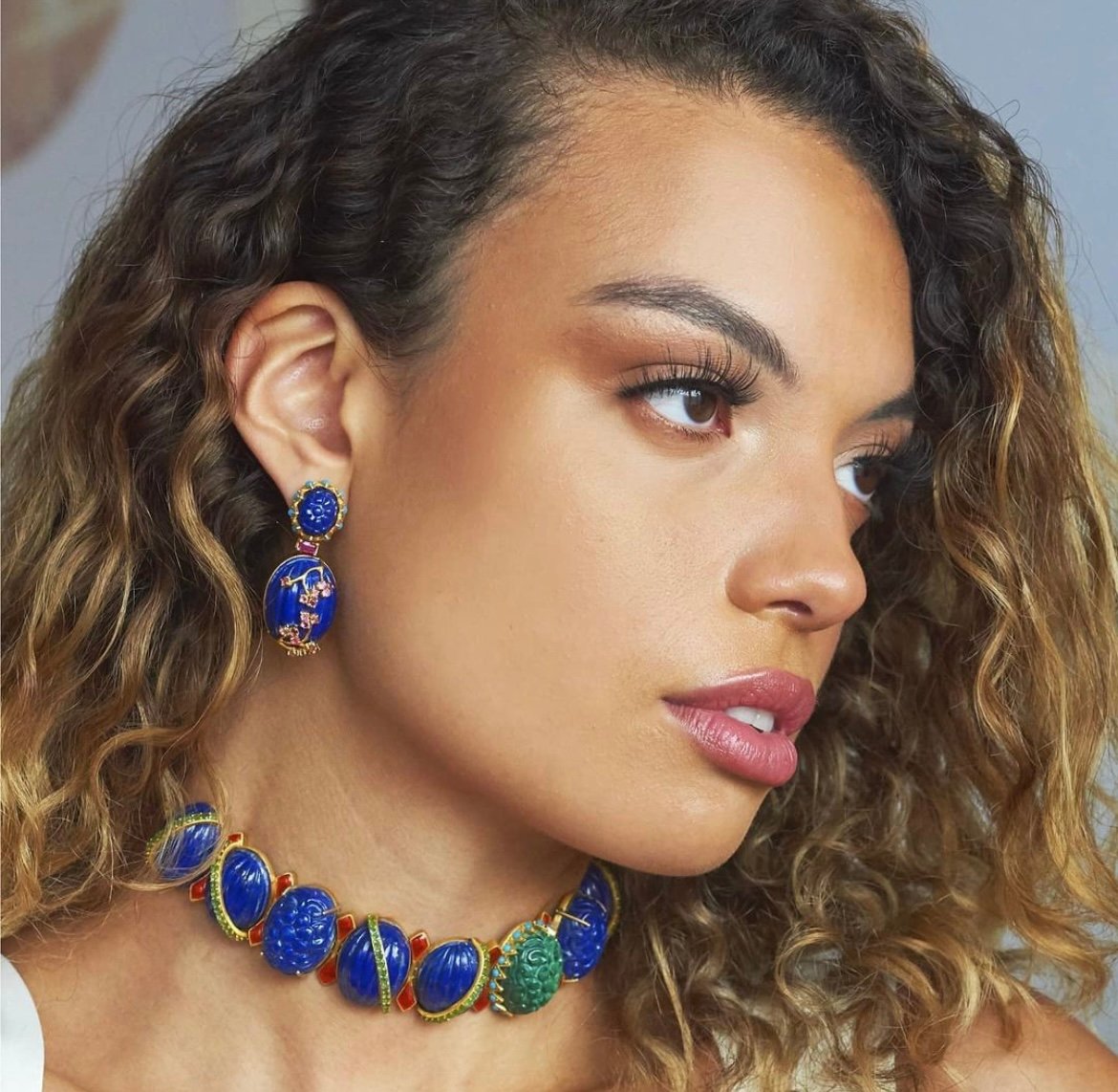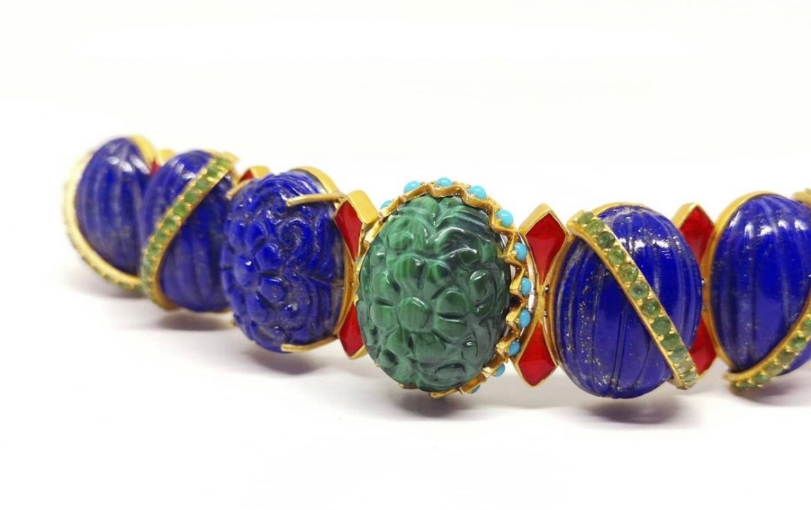 “Folio, a collection designed using hand carved multi coloured tourmalines and enamel work represents the way leaves change colour from spring to autumn while the mini Deco collection was inspired by my love of fine art. In essence, my jewellery is an outlet for my interests which I love to share with my clients. My recent collection Jardin Majorelle was inspired by the bright colours and the juxtaposition of cacti throughout the garden against the blue buildings in Marrakech. This was represented by hand carved gems set to seem like the garden itself.”