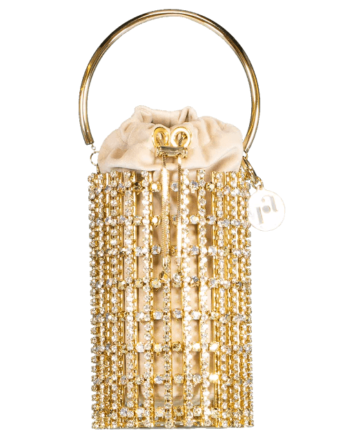 This Rosantica Artemide bag features a tall cylindar silhouette with crystal details. It also includes gold-tone hardware, a velvet draw pouch, and a brass top handle.