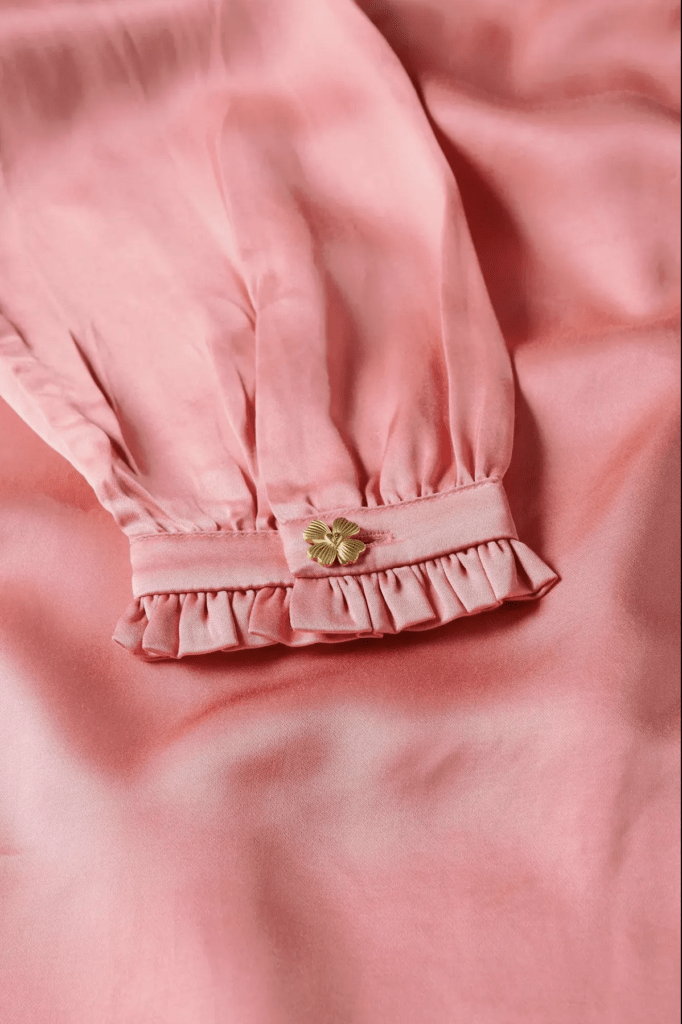 Cherry blossoms brought pink tone, floral reliefs and whimsical shapes of this blouse. This versatile garment can be worn with jeans, pastel shades pants and spring skirts. Highlight your features with natural make-up for an everyday look.