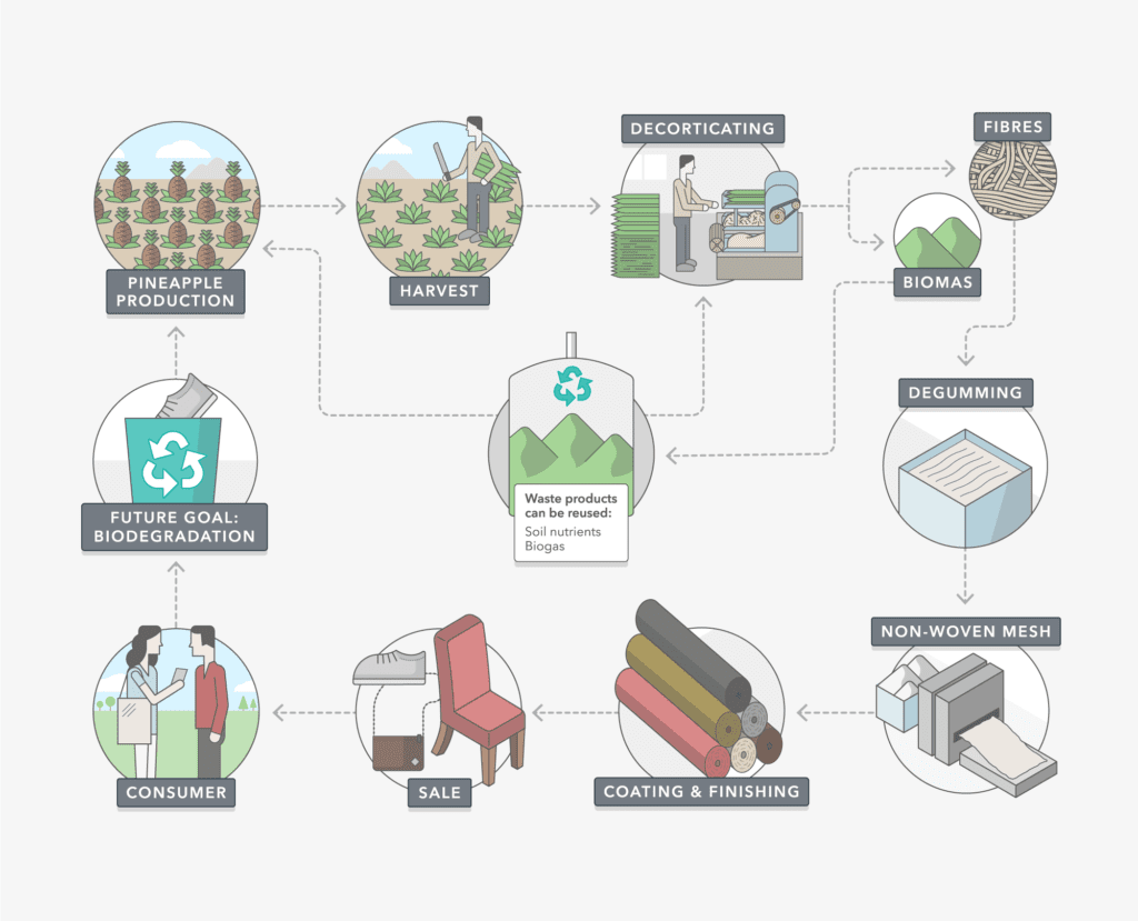 At it’s core, Piñatex is a product that is completely cradle to cradle – with it’s very idea of using agricultural wastage as its raw material, the entire process of producing the textile has a significantly lower environmental impact and also brings in better economic conditions for the farmers as it allows them to fully utilize their crop.