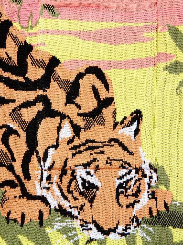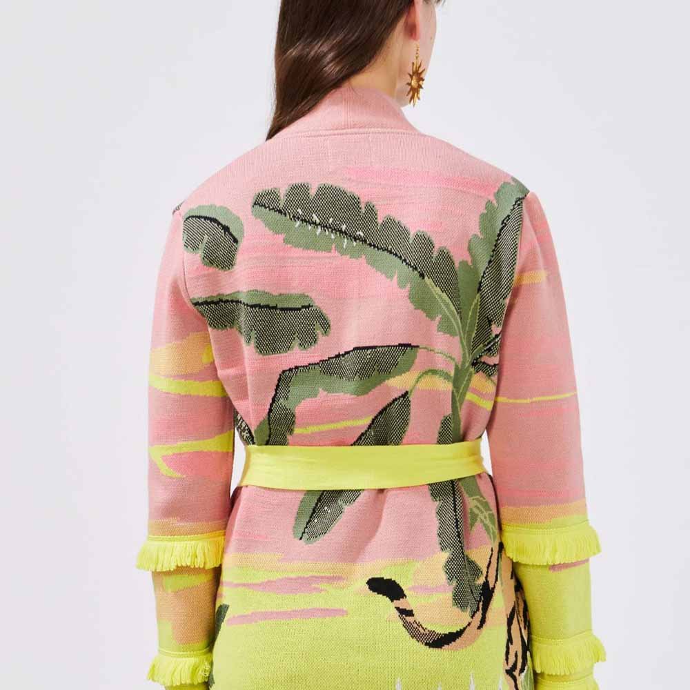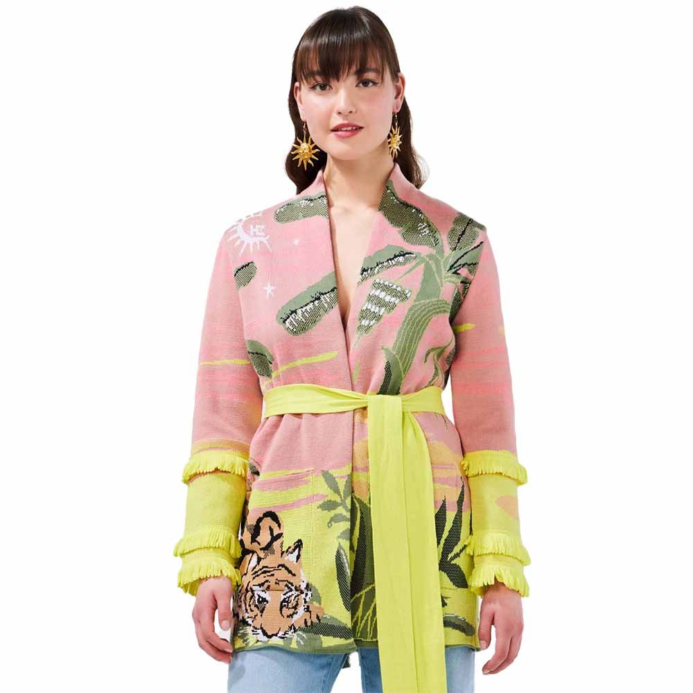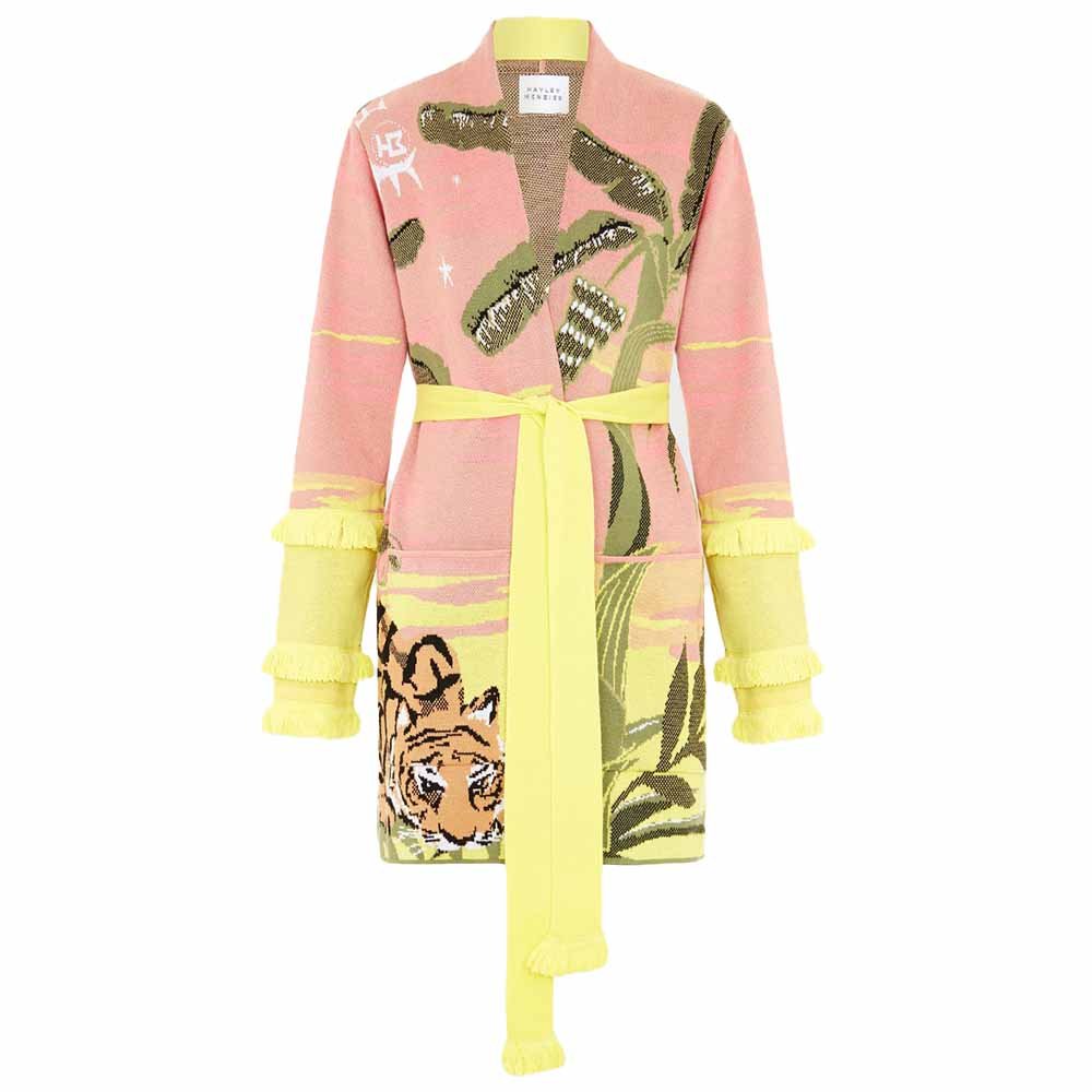 This super-soft short cotton cardigan speaks to the adventurous soul. An opulent explosion of colour and pattern, this cardigan takes over 7 hours to create. A graceful tiger drinks from the shore as palm fronds reach out to a sky that twinkles with Hayley’s signature medallions. A wild and exotic option for daywear and eveningwear alike.