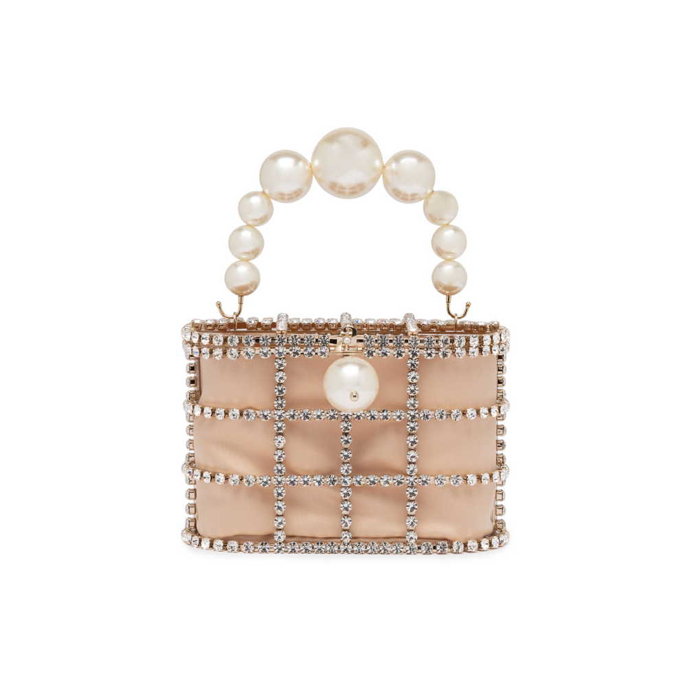 The “Holli” bag from Rosantica is crafted with crystals and faux pearls on a gold-tone brass frame. Undoubtedly Rosantica’s most iconic bag, this version of the Holli features clear crystals and a removable neutral-colored fabric pouch. The signature extra-large faux pearl handle is now removable, allowing the Holli bag to be worn with other unique shoulder straps, allowing for both shoulder and hand carry.