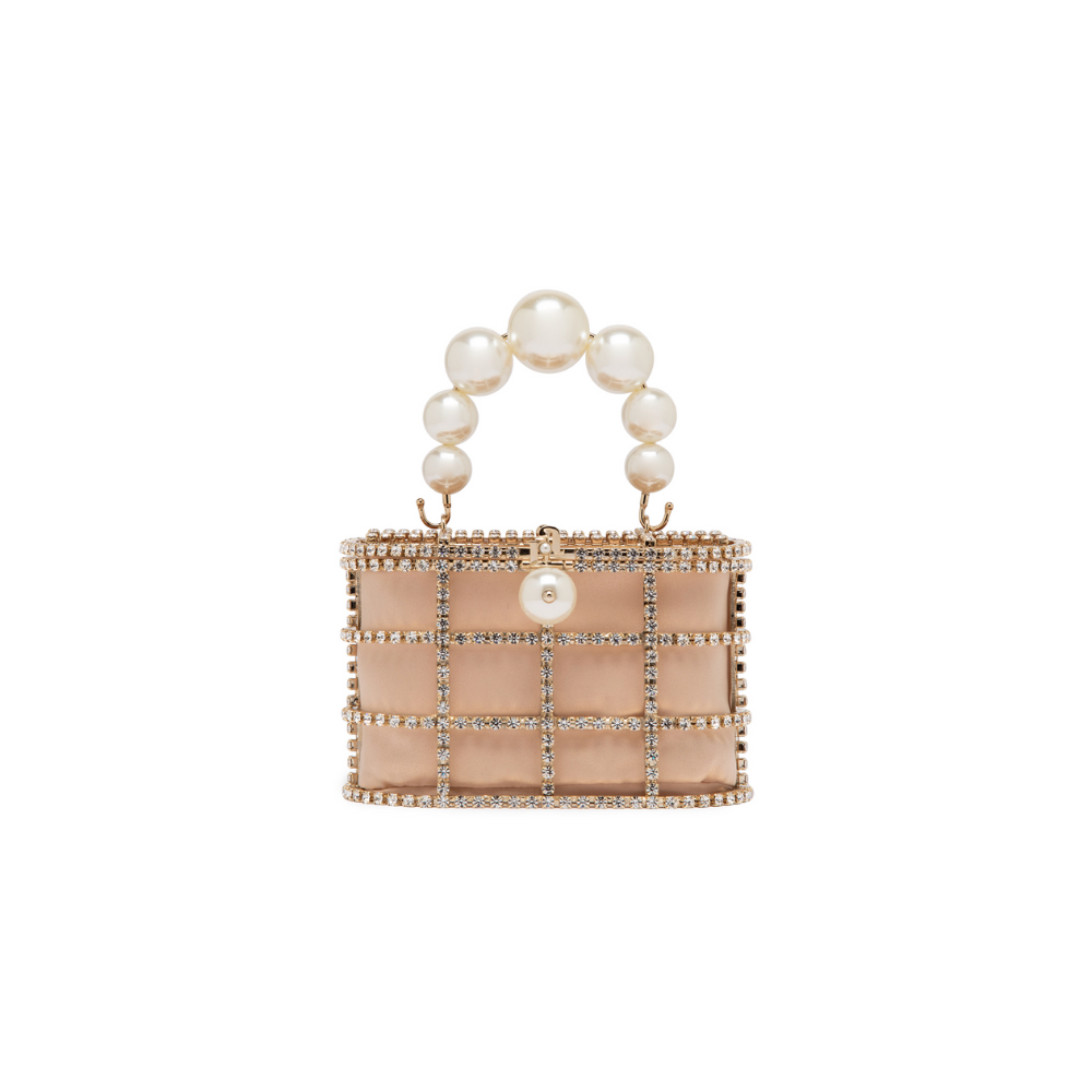 The “Mini Holli” is undoubtedly Rosantica’s most iconic bag. This smaller version of the Holli is crafted with crystals soldered onto a gold-tone brass base and comes with a removable, neutral-colored fabric pouch. The signature, extra-large, faux-pearl handle is removable, allowing this striking accessory to be paired with other unique and original shoulder straps, allowing for dual carry options: shoulder or hand.