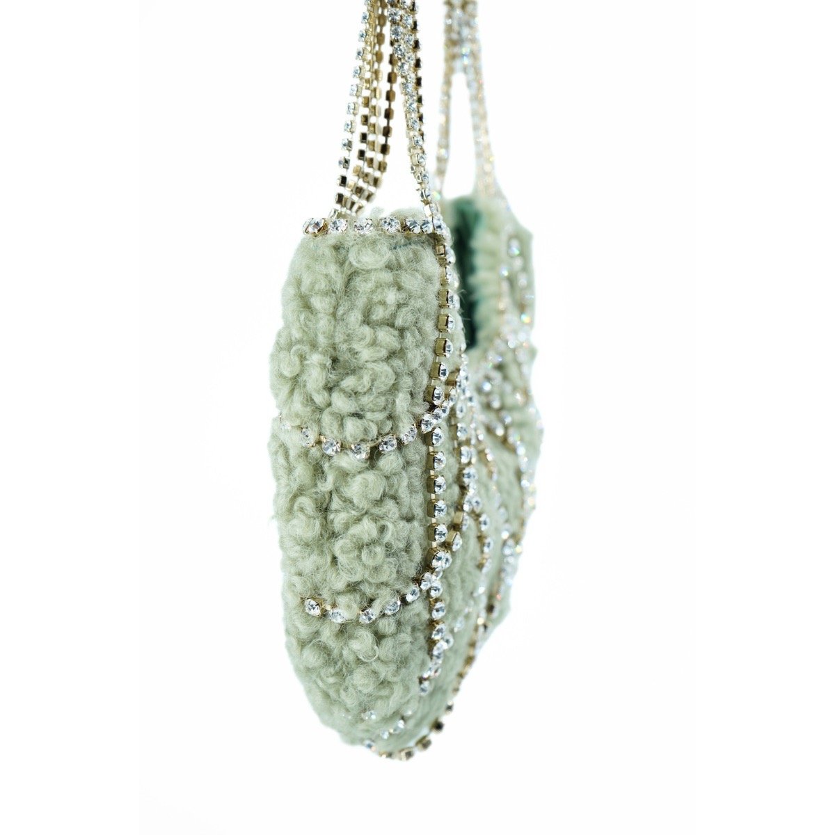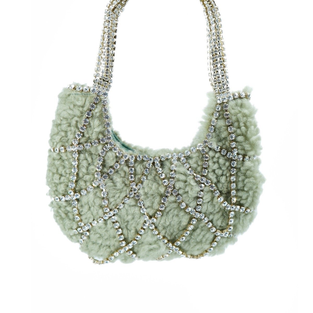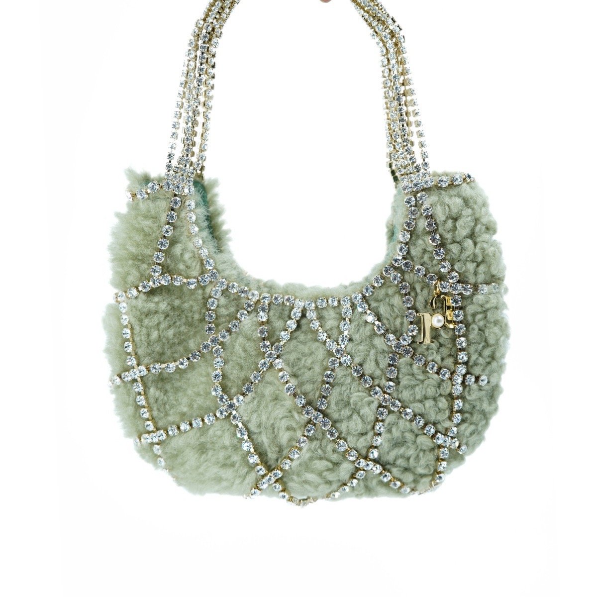 The Rosantica Sophia Teddy Green Bag is medium in size, half-moon shaped, has a large internal compartment with satin lining, an external part with crystal thread in a weave of openwork cutouts, a brand keychain with a pearl detail applied to the front, a fixed hand strap in crystals with a padded cutout and an internal top closure with a magnetic button.