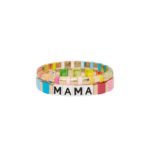 Rainbow stretch enamel bracelet with the letters mama hand painted. Multicolor and gold tone beaded bracelet with button closure.