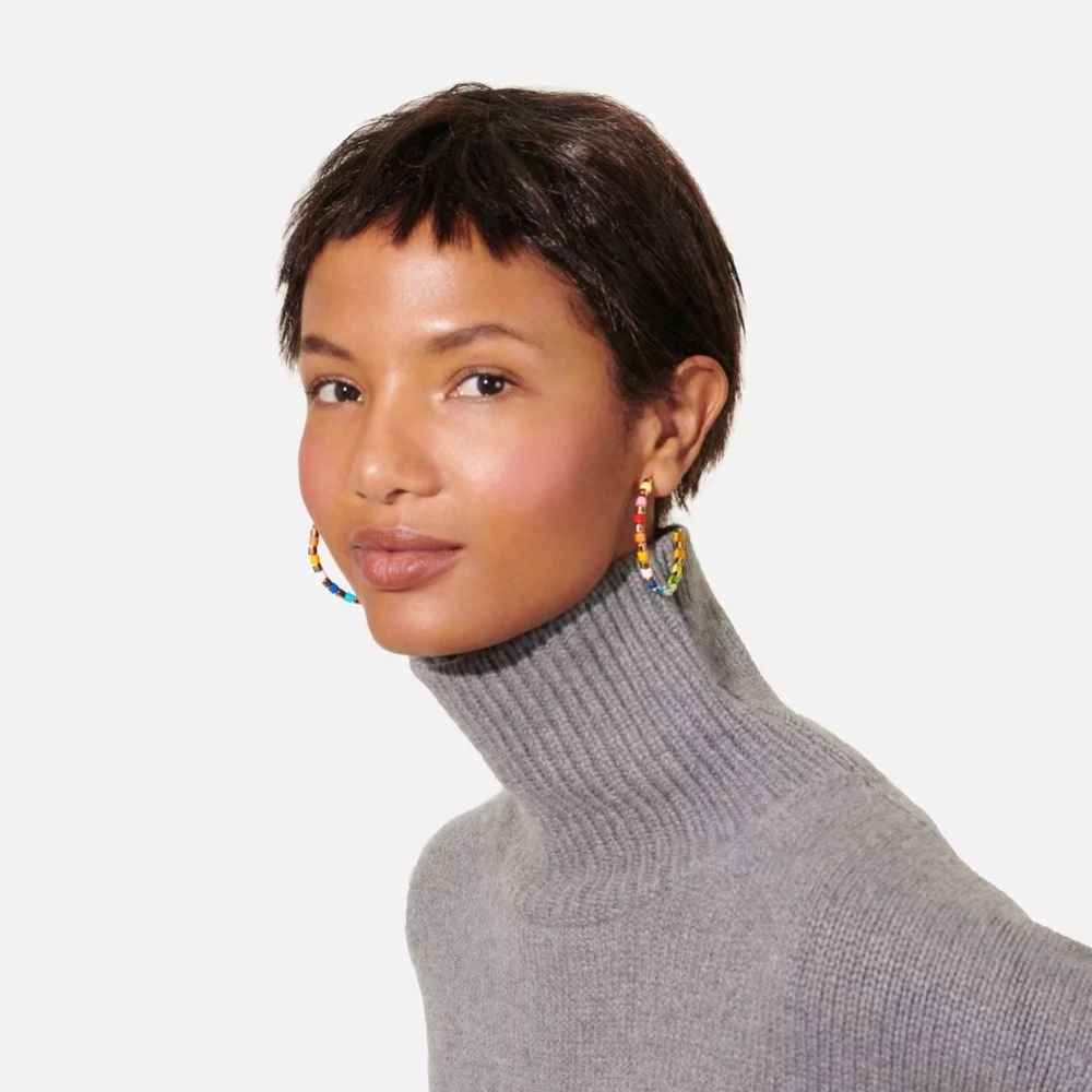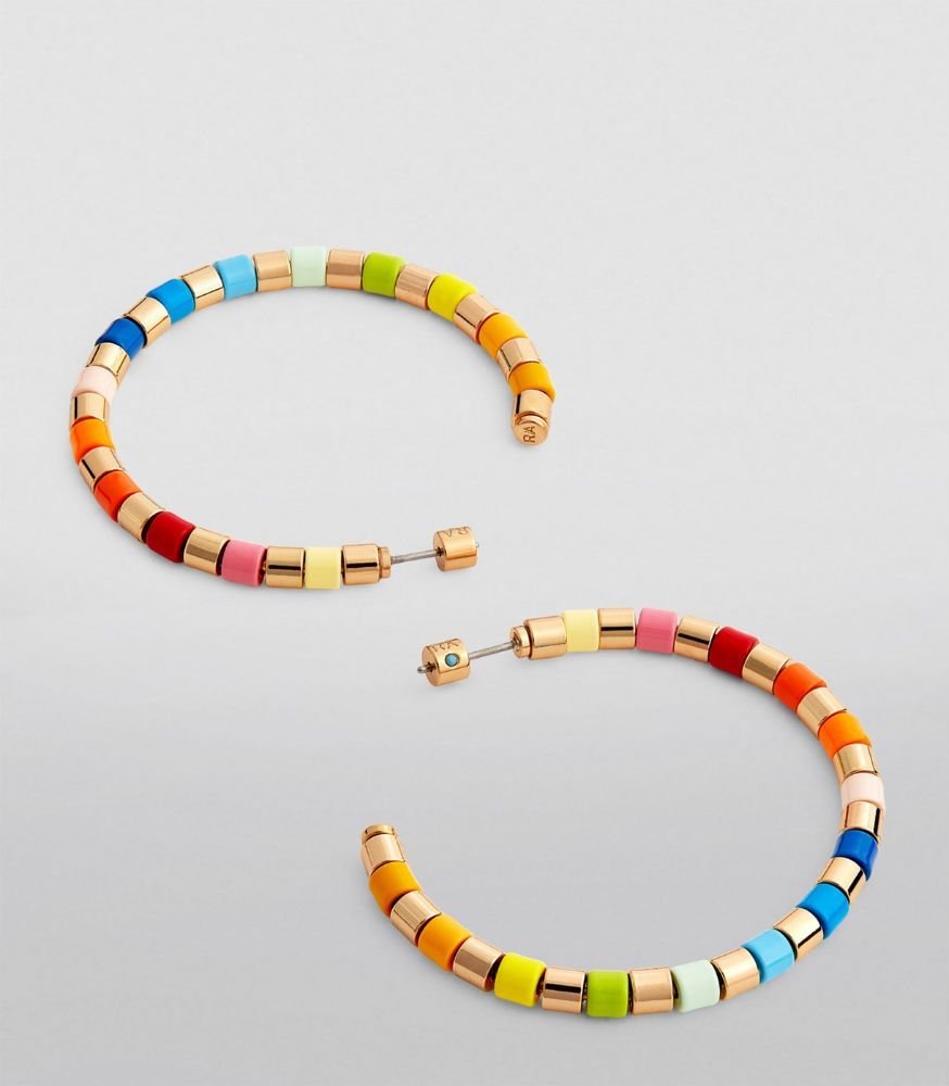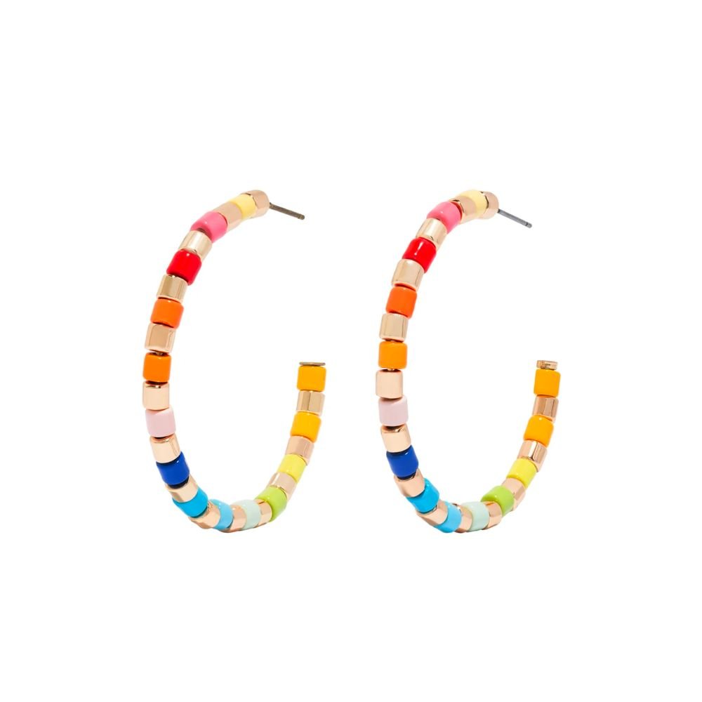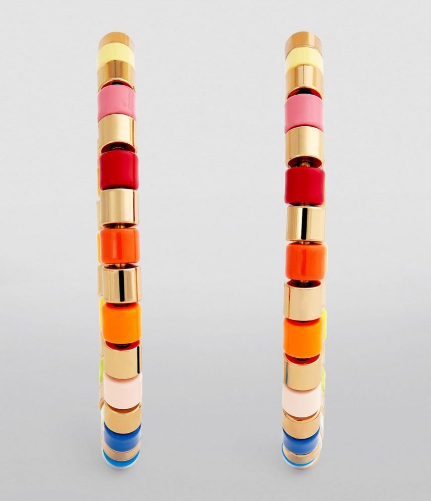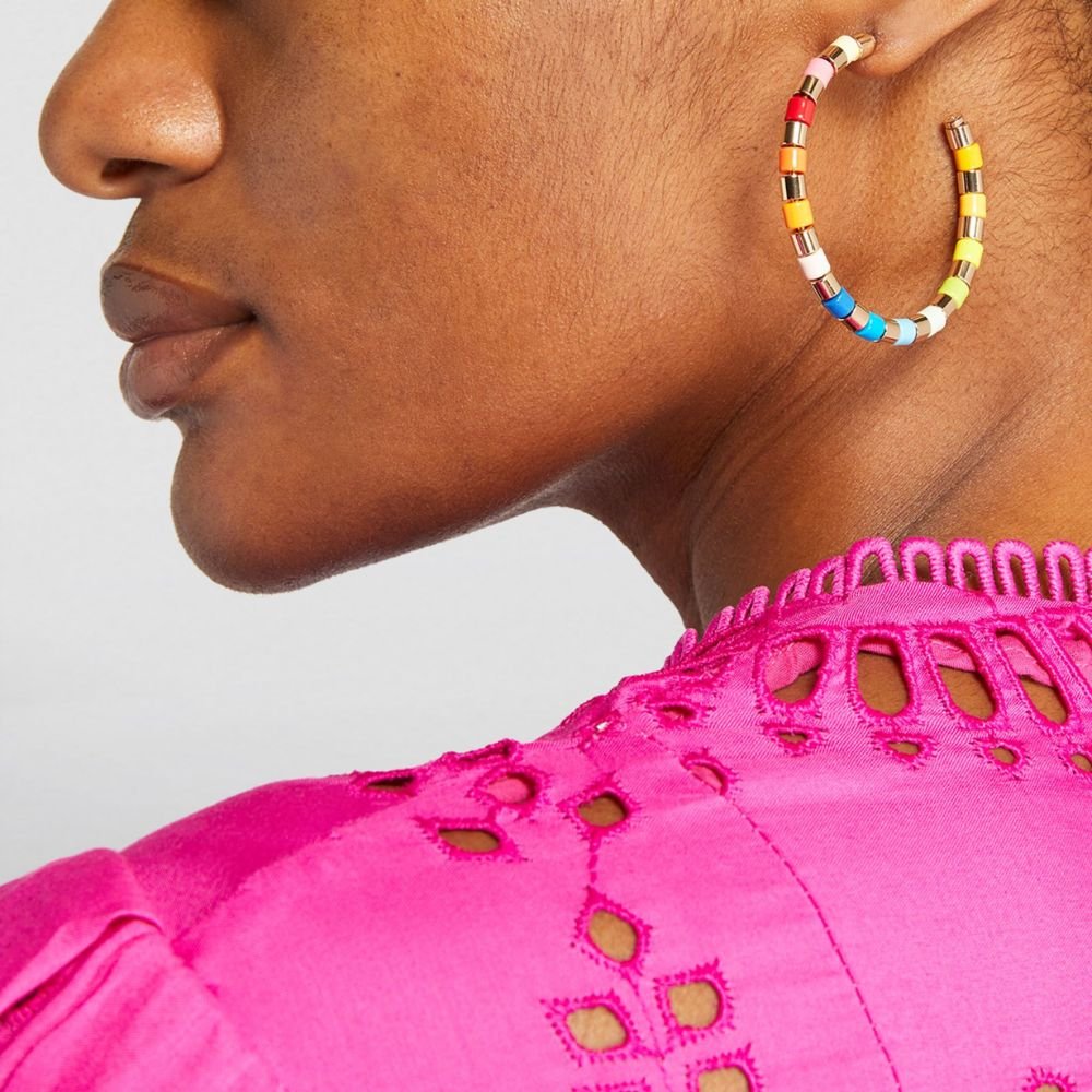 Roxanne Assoulin is based on the idea that everyday can be a special occasion, celebrated through sparkle and vibrant colour. The label’s jewellery reflects this idea, exhibiting minimalist designs in every hue of the rainbow, as seen with these Rainbow hoop earrings. Flashes of colour are separated by gold-tone beads for a fun but laid-back aesthetic.