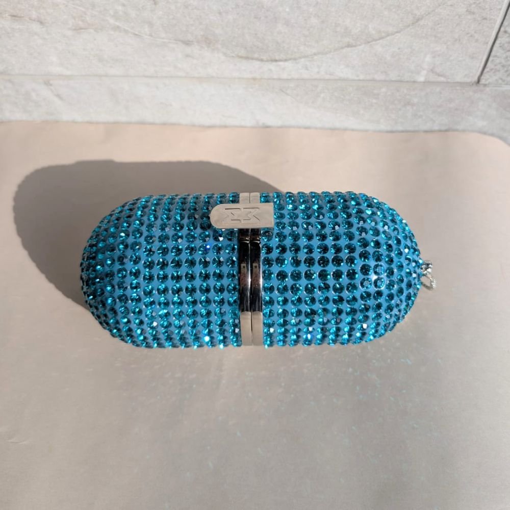 The Pill-Shaped Clutch from Marzook, showcases sophisticated style, crafted from high-quality resin and meticulously covered with shimmering clear Swarovski crystals. Silver-plated hardware, lock, and chain add a touch of luxury to this elegant piece, making it perfect for glamorous events, weddings, or a night out.