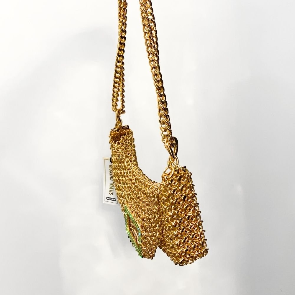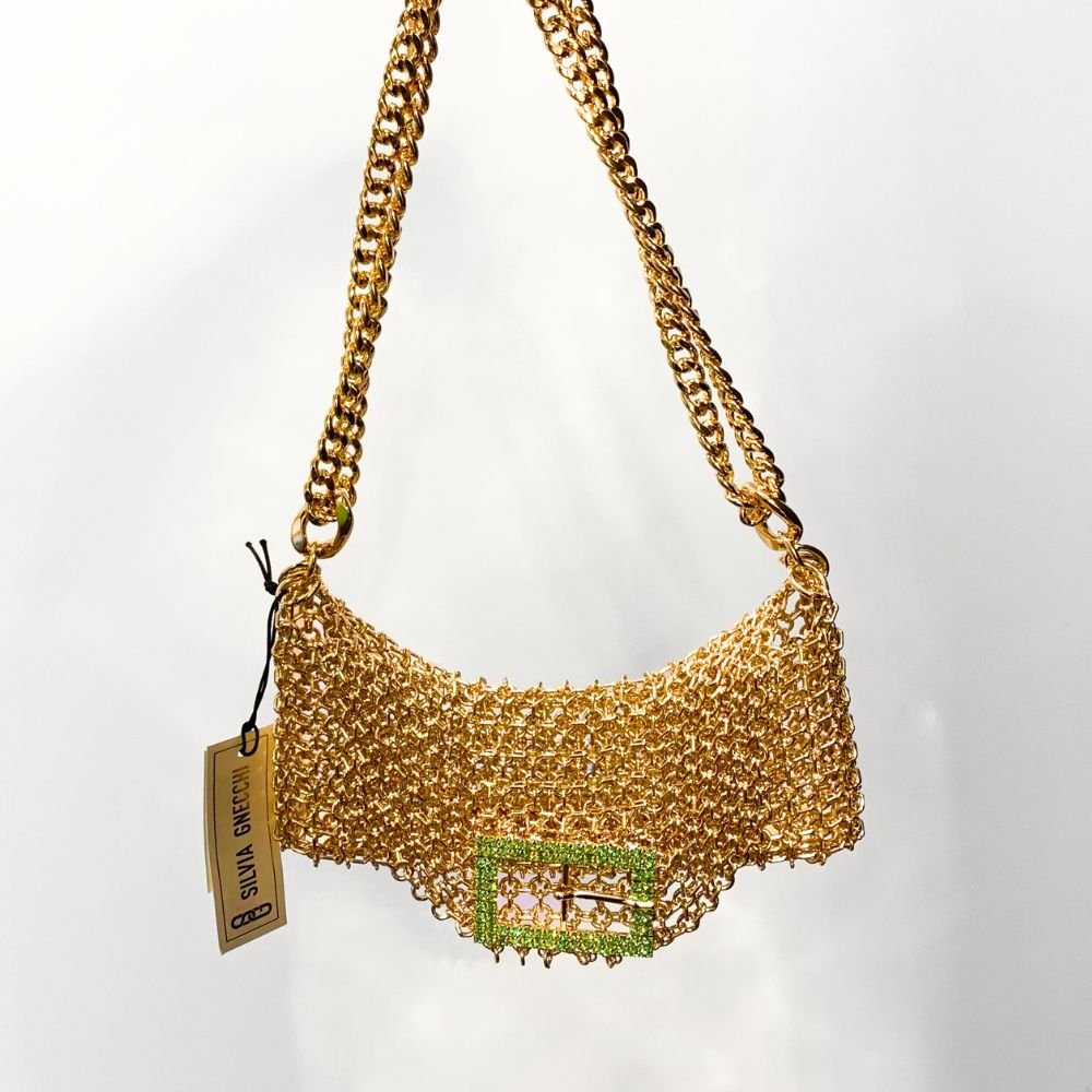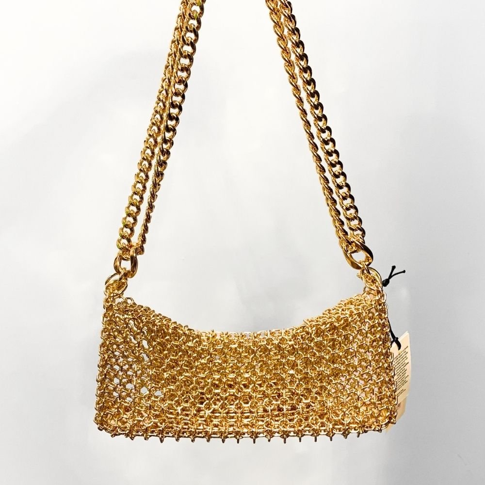 Made with brass handwoven by local artisans, its metal mesh is plated with 24K gold. It features a crystal buckle with internal closure. This bag requires 12 hours of manual work.