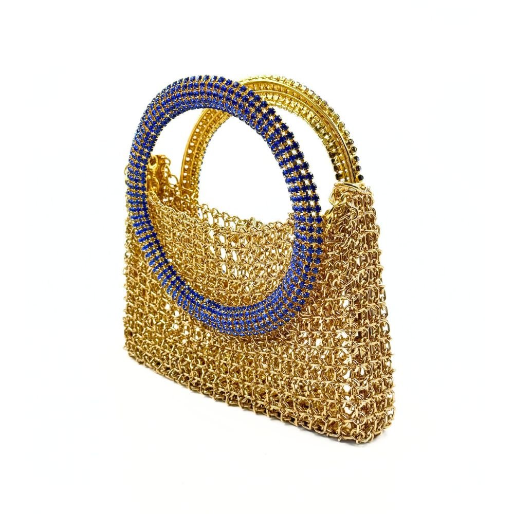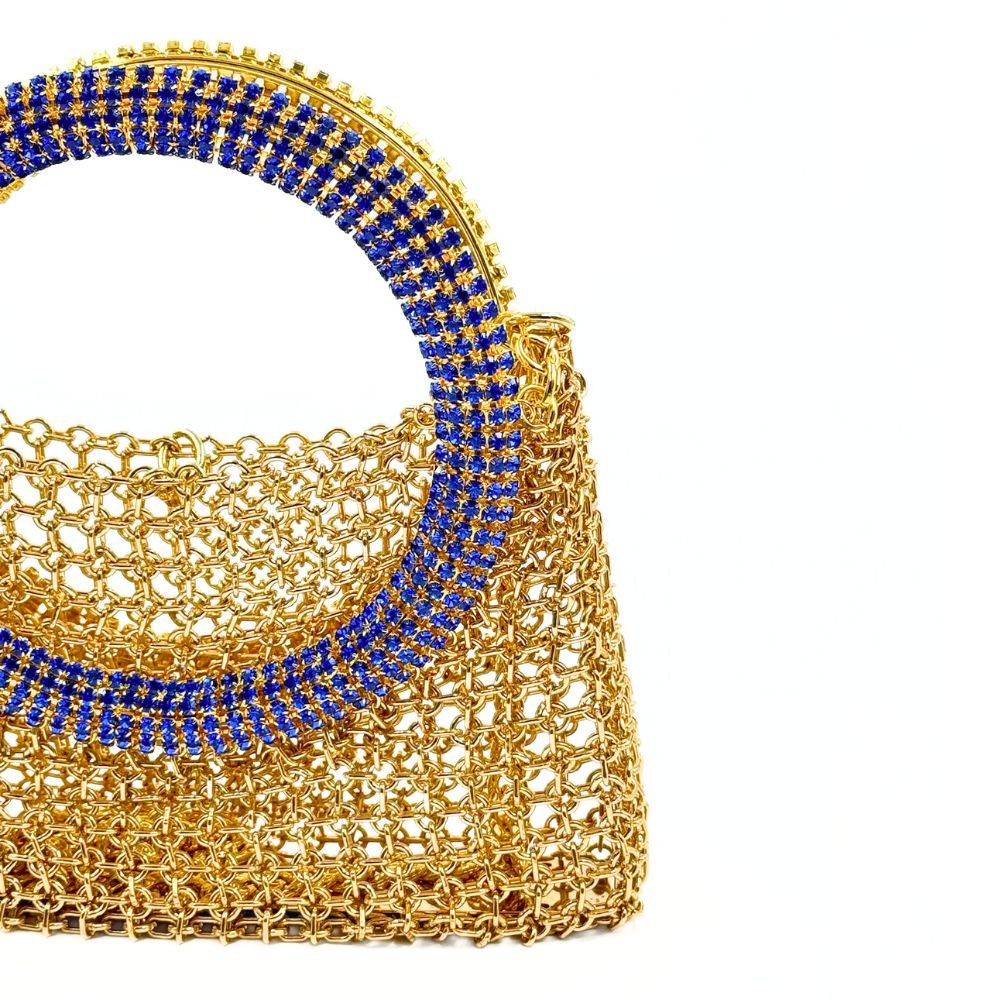 The Silvia Gnecchi Luna Bag is made using handwoven metal mesh. The bag features two round crystal-embellished handles that enhance the details.