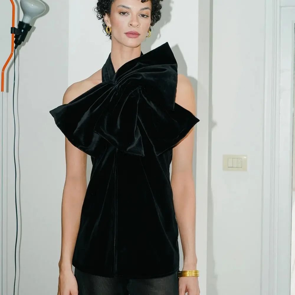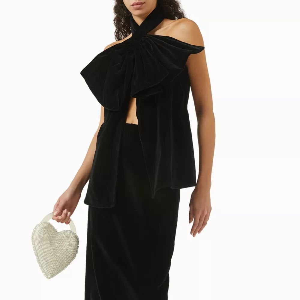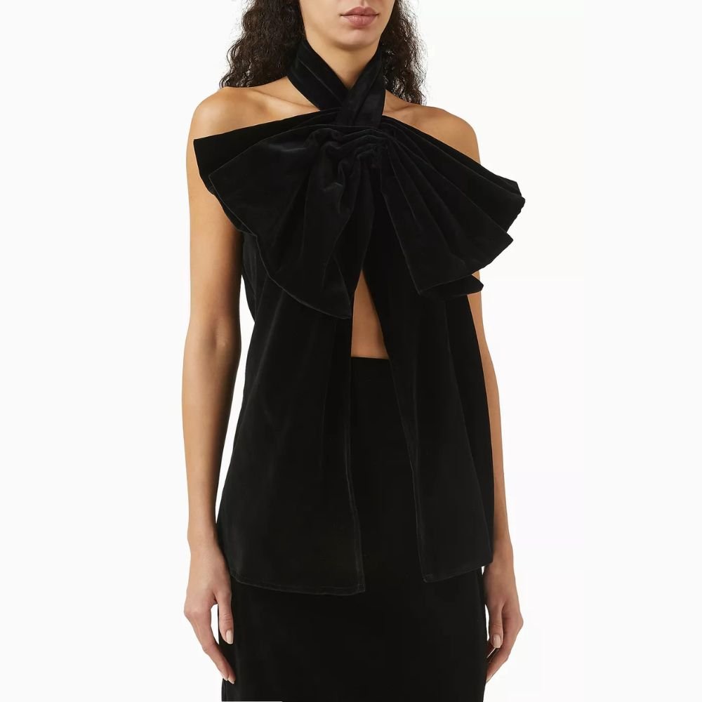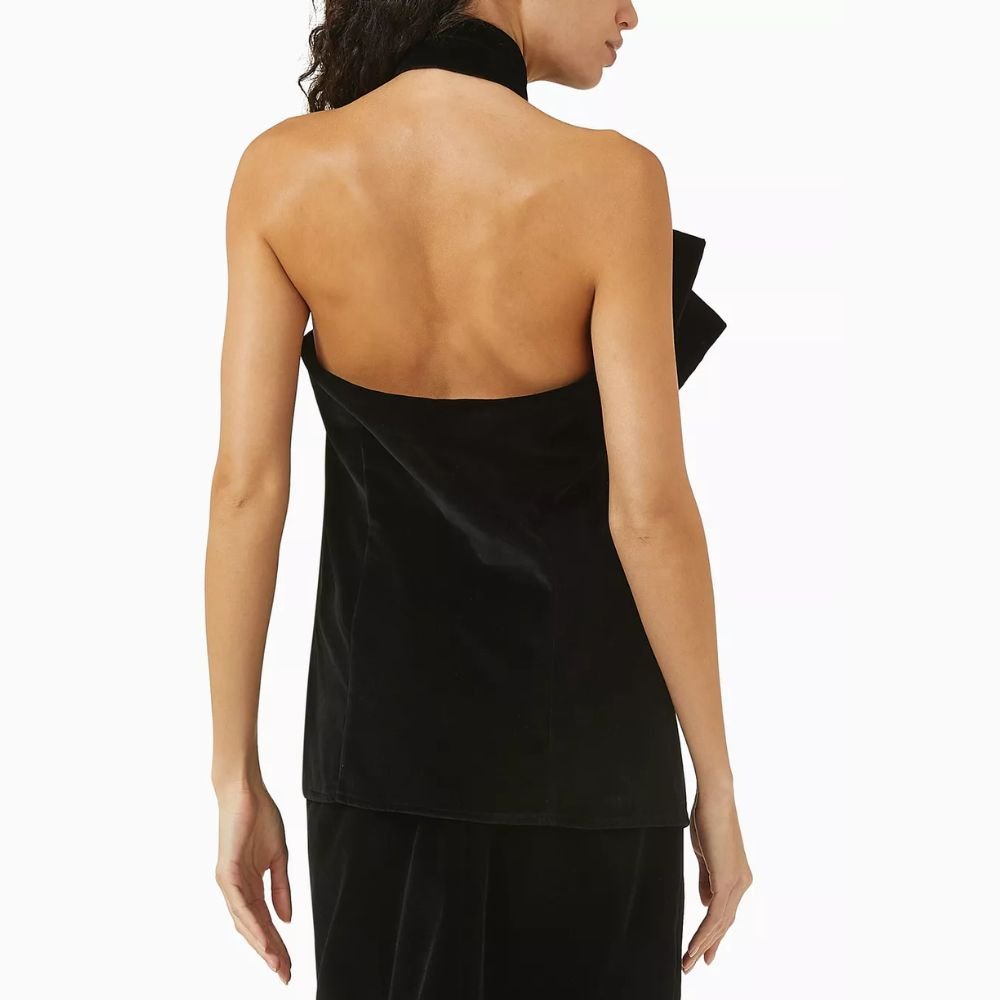 The ‘Duchesse’ top is a halterneck style with two overlapping bows on the neck and an open back. A statement piece for your evenings out. Crafted from luxurious plush velvet, this top blends elegance with a playful touch. Pair it with high-waisted pants and heeled sandals for a chic look sure to turn heads.