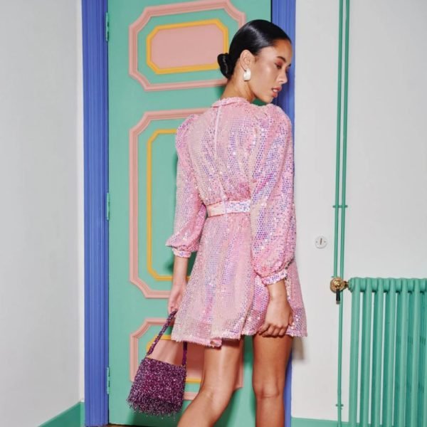 $399Designer: Celia B Description: Our iconic, swoon-worthy dress reimagined with pink sequins and iridescent ruffle trim. Super flattering for all shapes, feel comfortable and look amazing in this long sleeve, zip-up dress. Details: Composition: 100% polyester Dry Clean only, Do not bleach Logistics: You will be assigned a PERSONAL ACCOUNT…