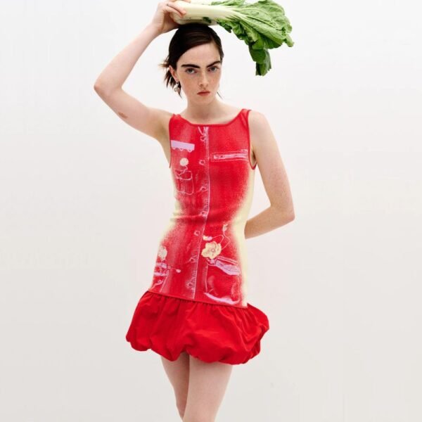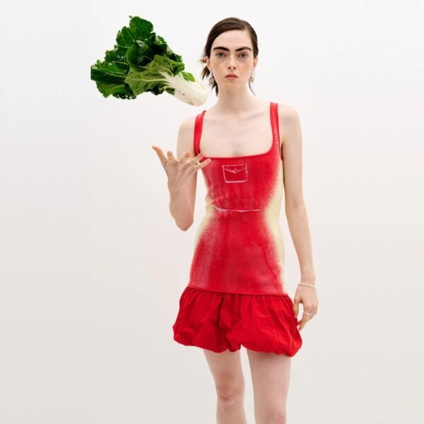 $467Designer: PH5 Description: The mixed media reversible tank dress from PH5 merges structure with fluidity. Incorporating textured, feathery cotton yarns, it mimics natural elements like grass and moss, grounding the piece in the earth. Trompe l’oeil utility details evoke activism, with symbolic flower cuttings and tools peeking from faux pockets.…