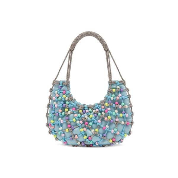 $946Designer: Rosantica Description: Iconic bag of the season, the “Nodi Mentine” model from Rosantica is hand-woven by expert craftsmen, with a yarn covered in small crystals and light blue cord, enriched with fun colored beads, which add a touch of fresh personality and uniqueness. The light blue satin fabric lining…