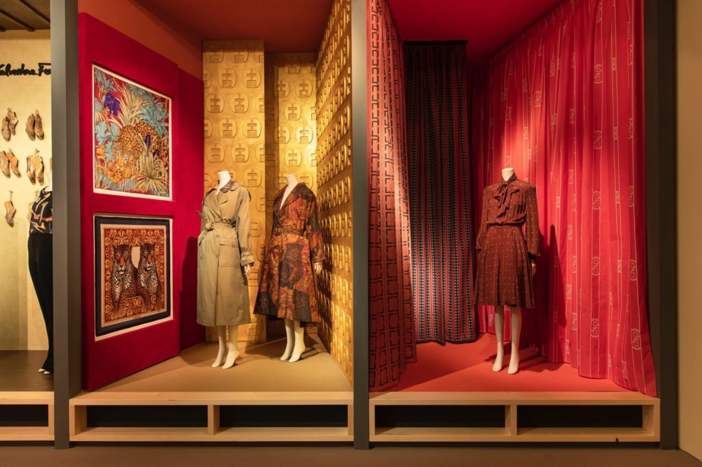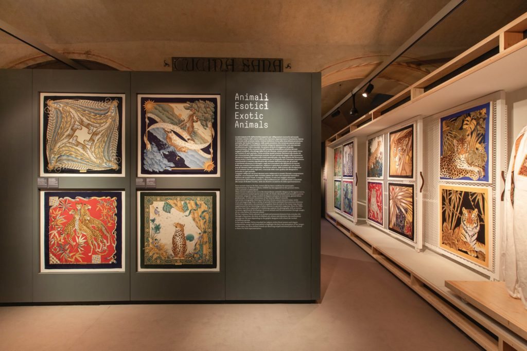 Flowers, exotic animals, jungles, fantastical savannahs and vibrant landscapes are some of the motifs that can be commonly spotted in the prints which are made in Como. The colourful and powerful designs were printed onto silk scarves and ties, transforming them into statement accessories. In one of the sections, you can view the key looks the brand has designed since the 1970s.