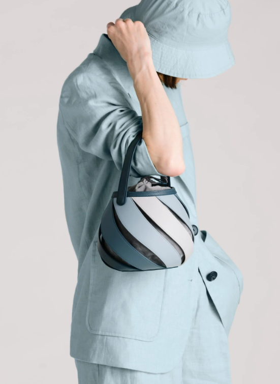 The Helix bag one of their unique pieces. It features swirling lines made with cow leather. The spinning silhouette has been inspired by the wind, making it the perfect example of modern art meeting a modern fresh perspective. You can carry your keys, sunglasses and phone in its soft suede interior. Make a statement wherever you go with this distinct charming bag.