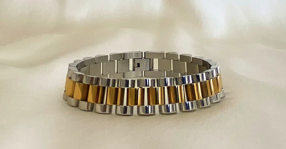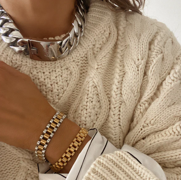 We especially love their silver and gold chunky watch bracelet. This two-tone accessory adds a touch of sophistication and luxury to any autumn look–whether you’re dressing up for work or a party. Make your mark as a woman of class with this chunky statement piece. For maximum impact, stack up this stainless steel bracelet with other ones from her collection.