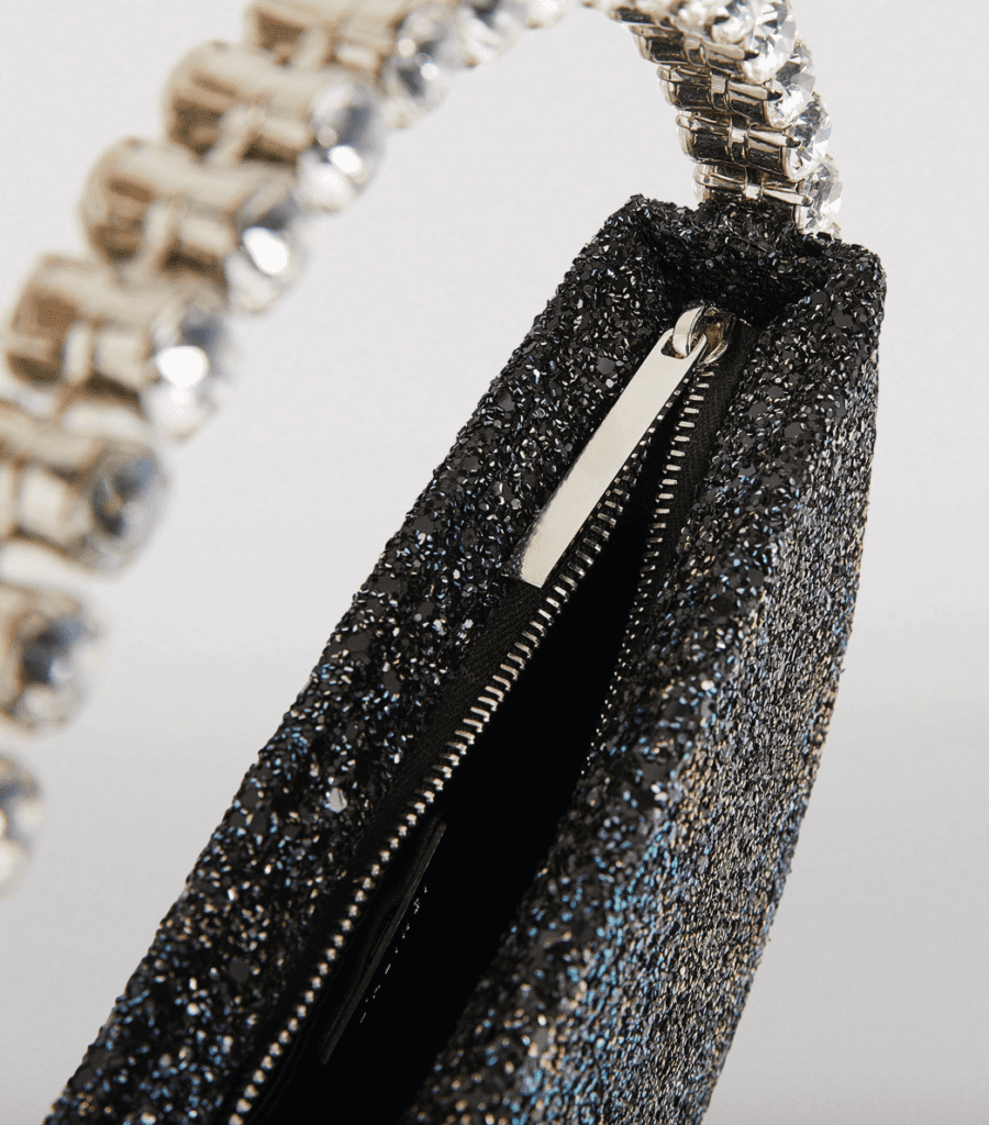 The inspiration for this bag is the glamour, elegance, and timelessness of a diamond ring band. It features dazzling grey glitter, mesmerising first grade crystal stones, rich brass and silver plating, and a delicate pink lining. Another perennial of classic, statement, and versatile details that can be paired with a show-stopping red carpet gown or even a fun party look.