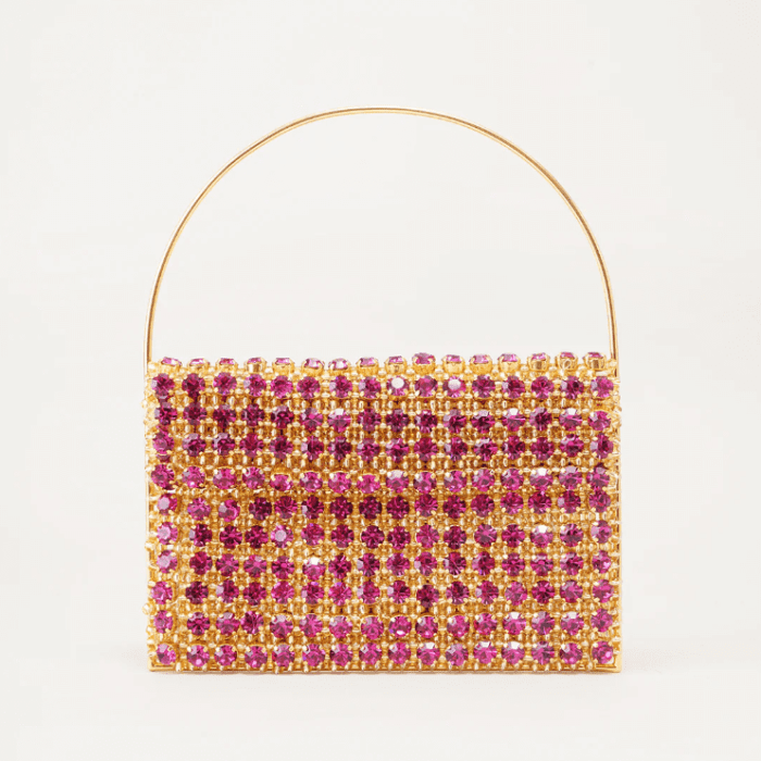 The classic silhouette of the baguette has been reworked by the brand in contemporary materials. The sparkling crystals make it fresh and party-ready while the gold-tone handle elevate its elegance.