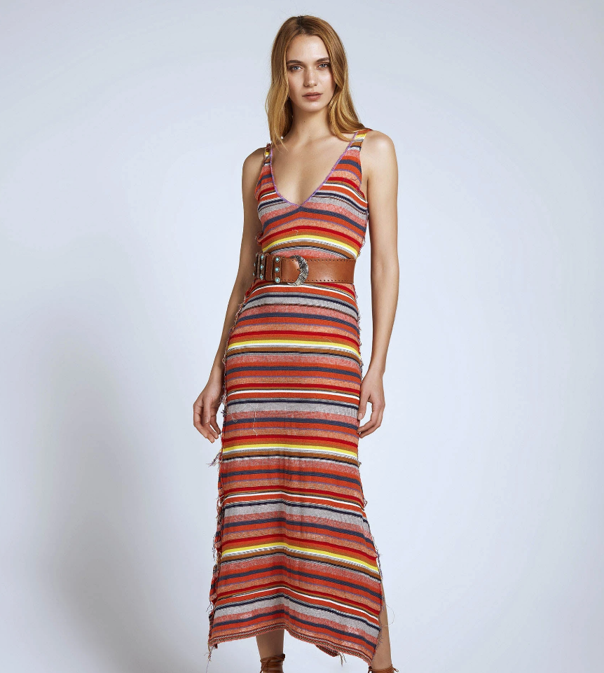 This striped long dress is the perfect elegant yet fun piece. Comfortable and colourful, pair it with a pair of strappy heels and shoulder bag to dress up the simple silhouette.